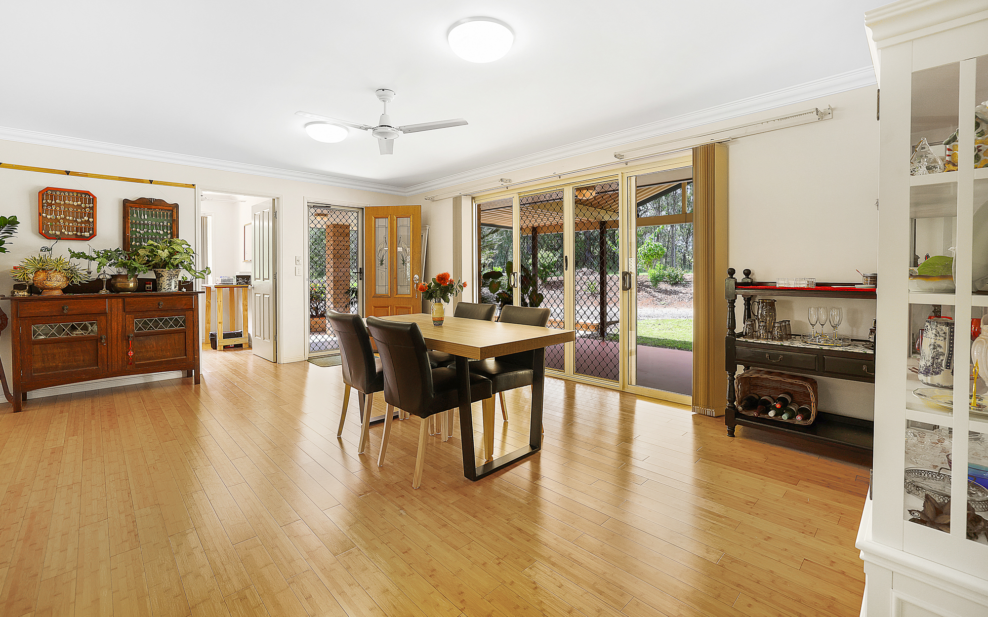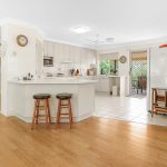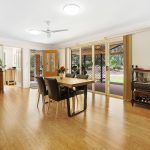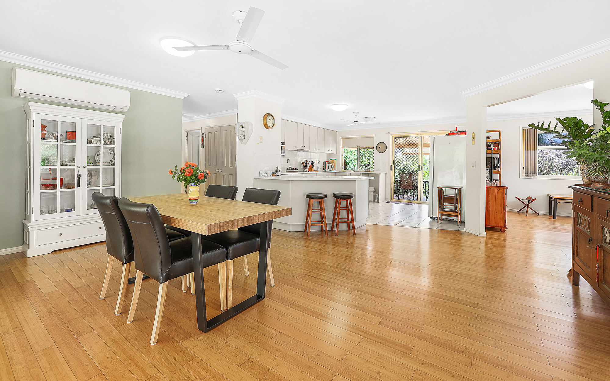 Electric appliances, multi-function fan-forced oven, ceramic cooktop, ducted rangehood, aircon in dining, kitchen tiled, dining with bamboo flooring